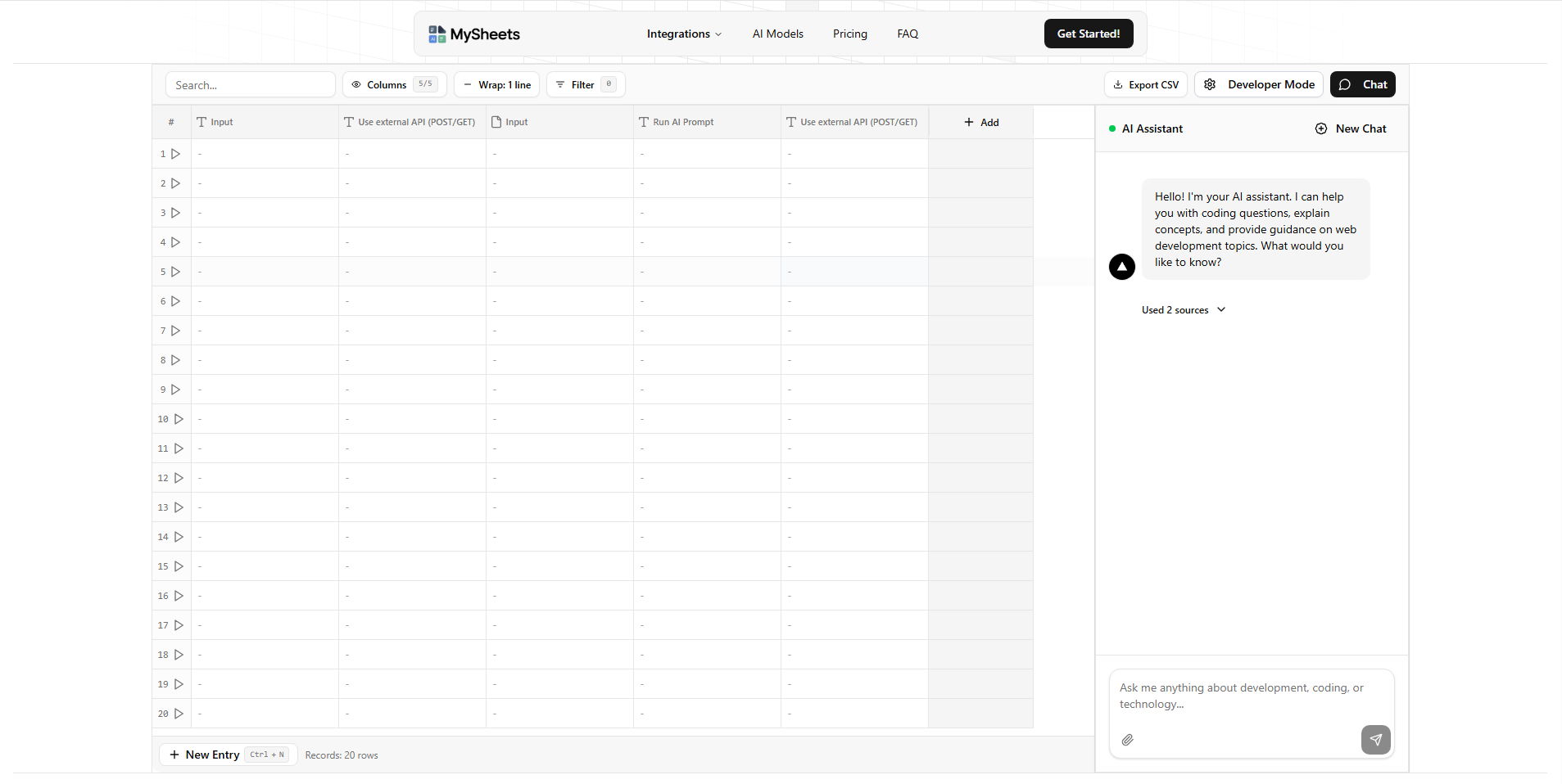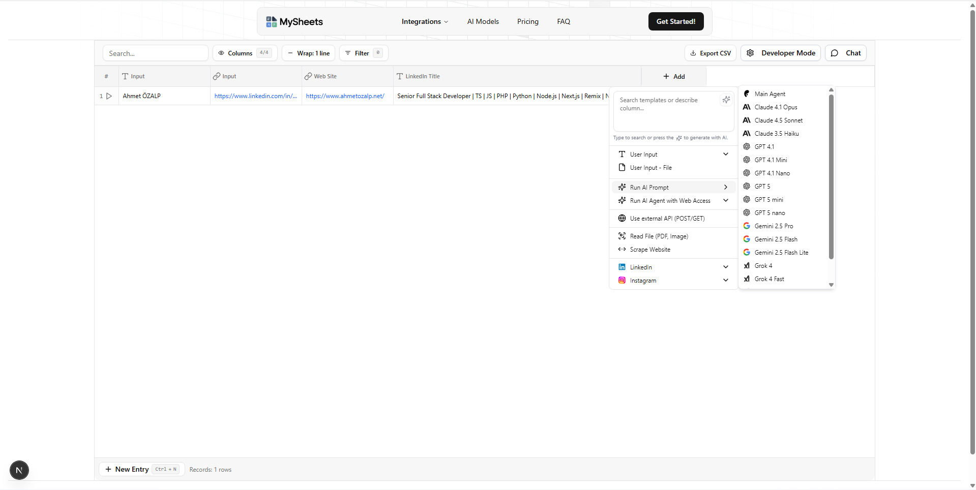 MySheets helps you build automated workflows using a familiar spreadsheet layout. You start with a trigger in the first column, then add steps across new columns—each powered by its own AI agent with custom prompts, models, and outputs. No coding required, just simple, visual automation.
